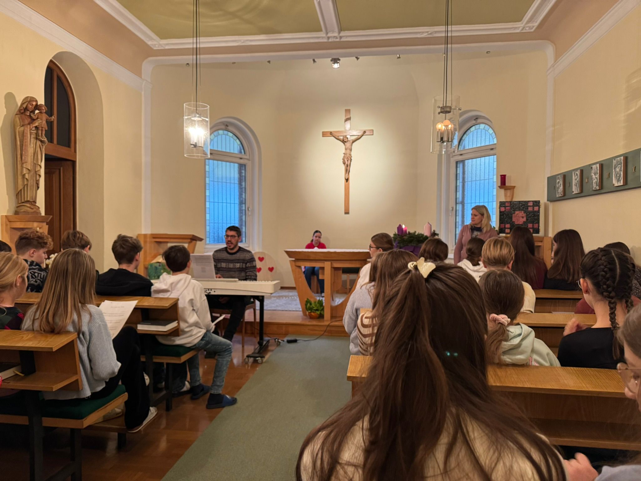 In der Adventszeit gibt es in der Kapelle der Klosterschule daher täglich eine Adventbesinnung. Von 7:45 bis 8:00 Uhr werden zu meditativer Musik besinnliche Texte gelesen. Schülerinnen und Schüler sowie Lehrerinnen und Lehrer können kommen, um sich abseits des Weihnachtstrubels einzustimmen. Oft ist die Kapelle bis auf den letzten Platz besetzt. Auch Stadtpfarrer Gabriel kommt gerne zu dieser kurzen Andacht. Jede Klasse hat sich etwas Besonderes einfallen lassen. Heute hatten wir sogar Live-Musik.