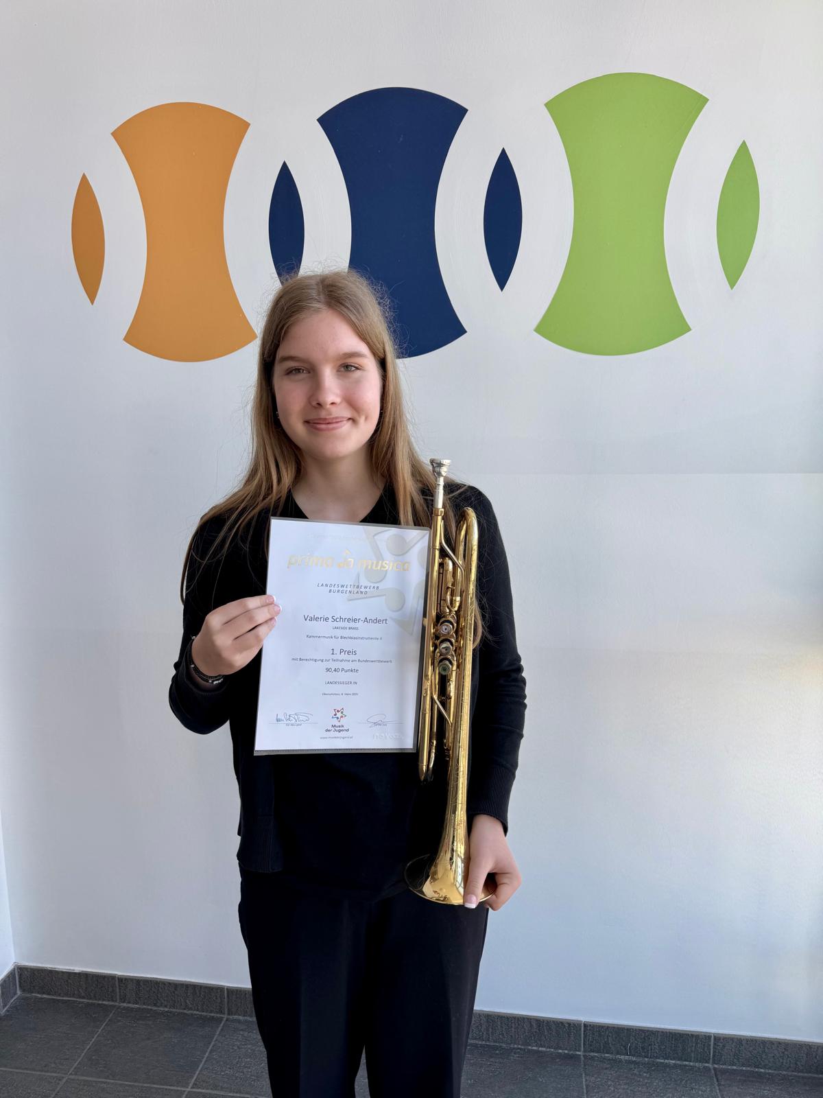 Valerie Schreier-Andert hat beim Landeswettbewerb „Prima la Musica“ den 1. Preis erreicht. Wir gratulieren ihr sehr herzlich zu diesem großartigen Erfolg und sind stolz auf ihre hervorragende Leistung.