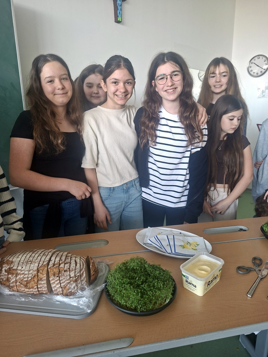 Ein besonderes Highlight war die gemeinsame Brotjause. Sophies Mama hat frisches, selbstgebackenes Brot zur Verfügung gestellt, das zusammen mit der geernteten Kresse verspeist wurde. Ein genussvoller Moment für uns alle! Ein großes DANKE an alle Beteiligten!