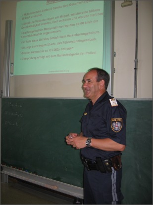 Zwei Herren von der Polizeidienststelle Neusiedl am See besuchten heute die 4abc, um die Schülerinnen über die Vorschriften in Bezug auf die Benützung von Zweirädern zu informieren. Es gab in einer Doppelstunde pro Klasse eine PP-Präsentation, Erläuterungen und Antworten auf Fragen der Mädchen.