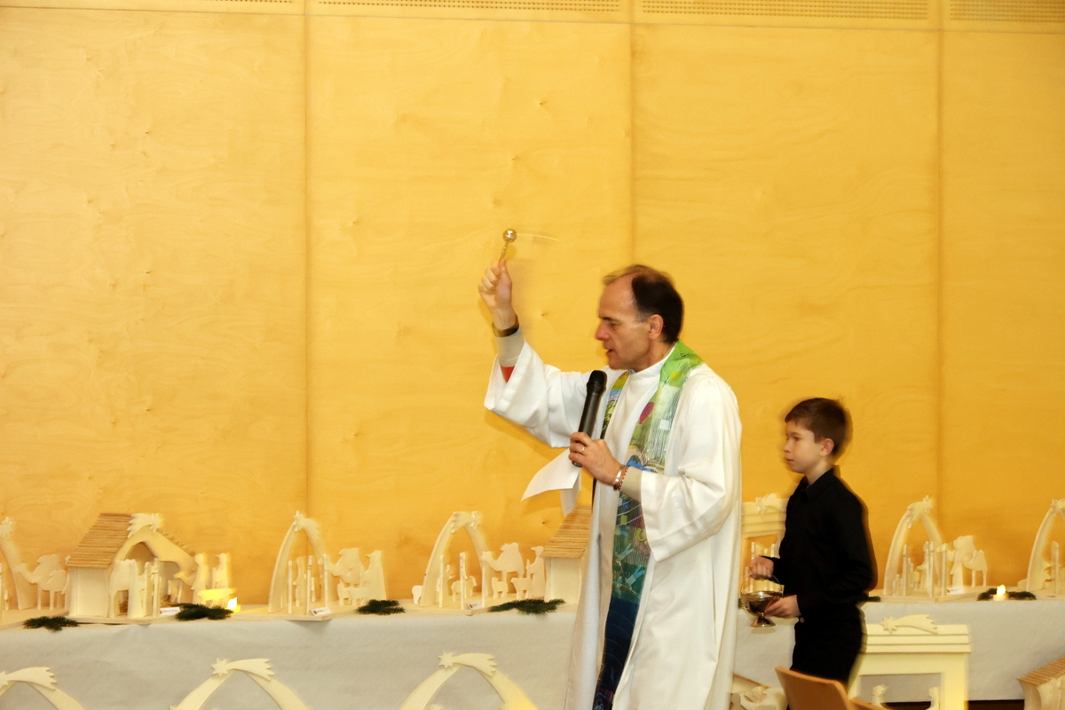 Stadtpfarrer Gabriel Kozuch segnete im Rahmen der Veranstaltung die von den Schülerinnen und Schülern im Werkunterricht gefertigten Krippen, die ihnen gewiss noch lange Freude bereiten werden.